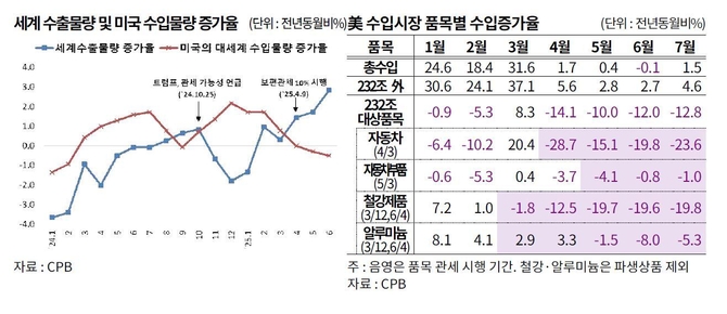 관세가 미국의 수입 둔화로 이어지는 이 같은 경향은 무역확장법 232조에 따라 품목별 관세가 붙은 자동차(4월 3일), 자동차 부품(5월 3일), 철강·알루미늄(3월 12일)에서도 마찬가지로 나타났다.