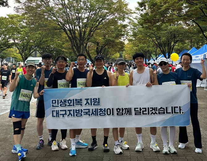 이날 대구지방국세청 및 일선 세무서 직원들로 구성된 러닝동호회 회원들은 민생회복을 염원하는 마음을 담아 전국 1만여명의 마라톤 동호인들과 함께 힘찬 레이스를 펼쳤다.
