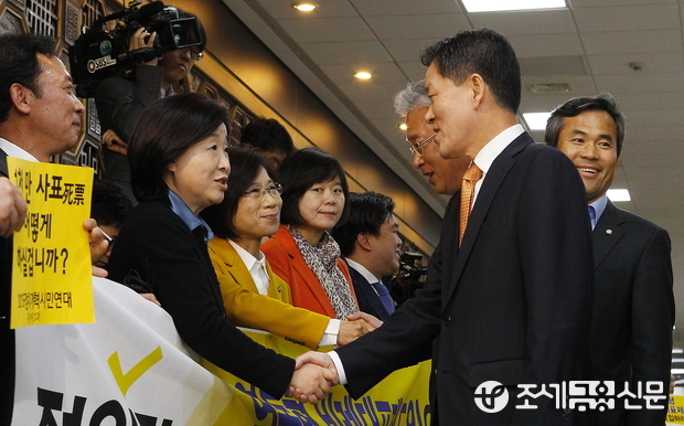 (조세금융신문=전한성 기자) 선거구 획정을 위한 여야 지도부 4+4 비공개 회담이 12일 오후 서울 여의도 국회 귀빈식당에서 열린 가운데 연동형 비례대표제 도입을 주장하는 정의당 심상정(왼쪽) 대표와 새정치민주연합 주승용 최고위원이 악수를 나누고 있다.