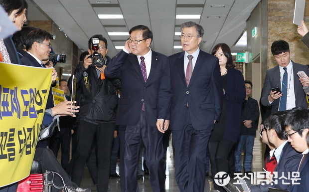 (조세금융신문=전한성 기자) 선거구 획정을 위한 여야 지도부 4+4 비공개 회담이 12일 오후 서울 여의도 국회 귀빈식당에서 열린 가운데 새정치민주연합 문재인 대표가 연동형 비례대표제 도입을 주장하는 정의당의 피켓을 보며 입장하고 있다.