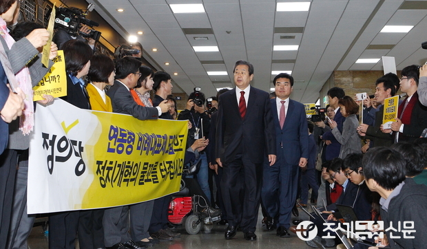 (조세금융신문=전한성 기자) 선거구 획정을 위한 여야 지도부 4+4 비공개 회담이 12일 오후 서울 여의도 국회 귀빈식당에서 열린 가운데 새누리당 김무성 대표와 원유철 원내대표가 연동형 비례대표제 도입을 주장하는 정의당의 피켓을 보며 입장하고 있다.
