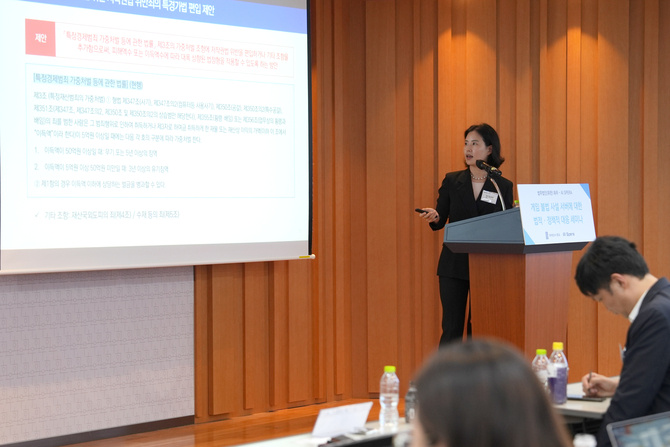 세 번째 세션에서는 설지혜 화우 변호사(연수원 36기)가 불법 사설 서버 대응을 위한 양형기준 강화, 침해 기술 이용자에 대한 처벌 강화, 특정경제범죄가중처벌법 적용 가능성 등 정책적 대안 방안을 다룬 '제도적 대안의 모색 - 양형기준, 이용자 처벌, 특정경제범죄가중처벌법 등'을 발표했다.