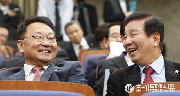 (조세금융신문=전한성 기자) 새누리당 의원총회가 12일 오후 서울 여의도 국회에서 열린 가운데 유일호(왼쪽) 전 국토교통부 장관이 박대동 의원과 밝은 표정으로 대화 나누고 있다.
