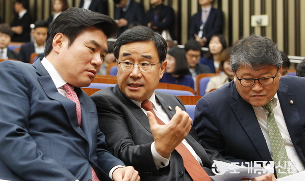 (조세금융신문=전한성 기자) 새누리당 의원총회가 12일 오후 서울 여의도 국회에서 열린 가운데 원유철(왼쪽부터) 원내대표, 김정훈 정책위의장, 조원진 원내수석부대표가 대화 나누고 있다.