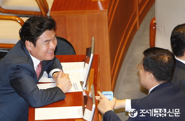 (조세금융신문=전한성 기자) 제337회 국회(정기회) 제11차 본회의가 12일 오후 개의된 가운데 새누리당 원유철(왼쪽) 원내대표가 김광림 의원과 대화 나누고 있다.