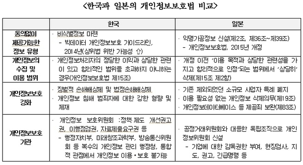 김수연 한경연 연구원은 “우리나라와 개인정보 보호강도가 유사했던 일본도 지난 9월 빅데이터 활용을 위해 개인정보보호법을 대폭 손질했다”며, “일본의 법 개정 내용을 벤치마킹할 필요가 있다”고 주장했다.