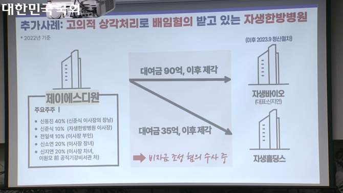 김 의원은 제이에스디원은 2020~2023년 자생홀딩스는 4.6%로 이자율을 받고, 자생바이오는 2%대로 이자를 받았는데, 계열사 간 부당 지원 및 증여 문제가 발생한다고 지적했다.