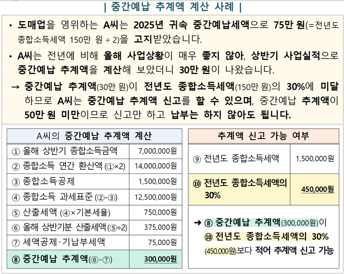 중간예납 추계액이 50만 원 미만인 경우에는 추계액 신고만 하고 실제 납부는 하지 않아도 된다.