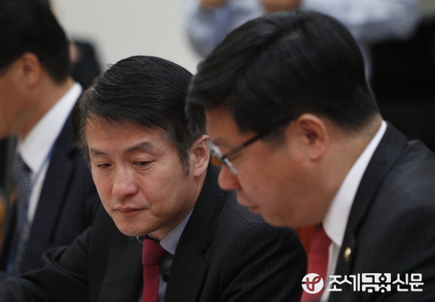 (조세금융신문=전한성 기자) 제337회국회(정기회) 제4차 조세소위원회가 18일 오전 서울 여의도 국회 기획재정위원회 소회의실에서 열린 가운데 문창용 기획재정부 세제실장이 주형환 기획재정부 제1차관과 귀엣말을 나누고 있다.