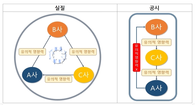 A사는 같은 그룹 내 B사, C사와 A→B→C→A로 이어지는 순환출자 구조를 갖고 있었고 각사는 서로의 최대주주에 해당했다. 또한 특정 임원이 A사와 B사 이사를 겸직하는 등 경영진의 유의적인 상호 교류 역시 존재했다.
