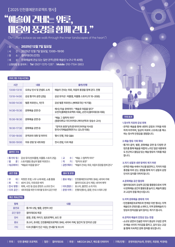 (조세금융신문=구재회 기자) 인천 지역 문화예술 교류 활성화와 시민 정서 치유를 목표로 한 인천홍예문프로젝트가 오는 7일(일) 인천 EOS 갤러리에서 두 번째 문화예술 프로그램 “예술이 건네는 위로, 마음의 풍경을 함께 걷다”를 개최한다.