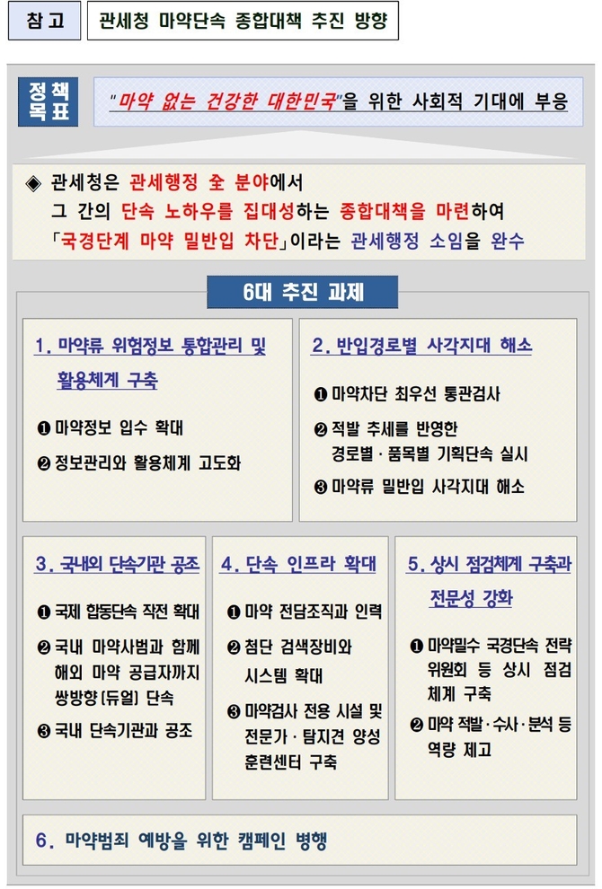 이번 마약단속 종합대책 주요 내용을 살펴보면 ▲위험정보 통합관리 활용체계 구축 ▲반입경로별 사각지대 해소 ▲국제 합동단속 작전 확대 ▲단속 인프라 확대 ▲상시 점검체계 구축과 전문성 강화 등의 내용이 담겼다.