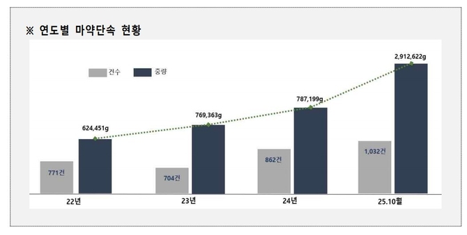 (조세금융신문=안종명 기자) "지난해 대비 중량이 2913kg, 384%로 증가했습니다. 참고로 중량 기준 역대 최대 적발량입니다"