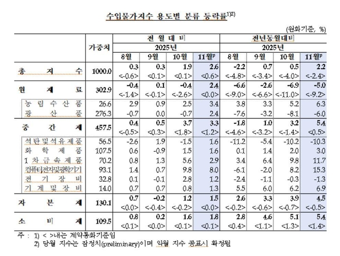 이문희 한은 물가통계팀장은 "국제 유가는 하락했지만, 원/달러 환율 상승 등의 영향으로 원화 기준 수입 물가가 전월 대비 2.6%, 전년 동월 대비 2.2% 상승했다"고 설명했다.