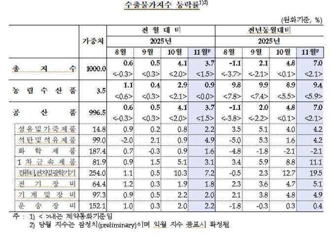 주로 석탄·석유제품(+4.9%)·컴퓨터전자광학기기(+7.2%)·1차금속제품(+3.1%) 등이 수출 물가를 끌어올렸다.