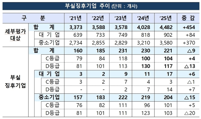 정기 평가 외에 수시 평가까지 합산하면 올해 부실징후기업은 총 473개사로, 전년 대비 46곳 증가했다.