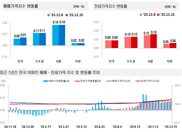 18일 한국부동산원이 발표한 12월 셋째 주(12월 15일 기준) 주간 아파트 가격 동향에 따르면 서울 아파트 매매가격은 전주와 동일한 0.18% 상승을 기록했다. 전국 매매가격 상승률은 0.07%로 소폭 확대됐지만, 서울과 수도권의 상승률은 지난주와 같은 수준에 머물렀다.