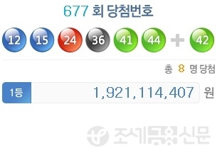(조세금융신문=김태효 기자) 지난 21일 실시된 제 677회 나눔로또 추첨결과 1등 당첨번호는 12, 15, 24, 36, 41, 44이다. 2등 보너스번호는 42번이다.