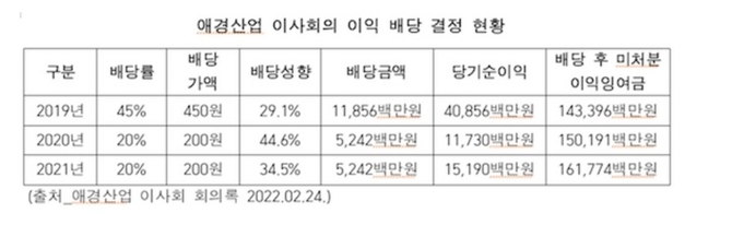 윤미향 의원이 공개한 애경산업 이사회 자료에 따르면 회사는 2019년 118억5600만원(배당성향 29.1%), 2020년 52억4200만원(배당성향 44.6%), 2021년 52억4200만원(배당성향 34.5%)씩 각각 배당했다. 따라서 애경산업은 그간 오너일가의 주머니 역할을 톡톡히 수행해왔다.