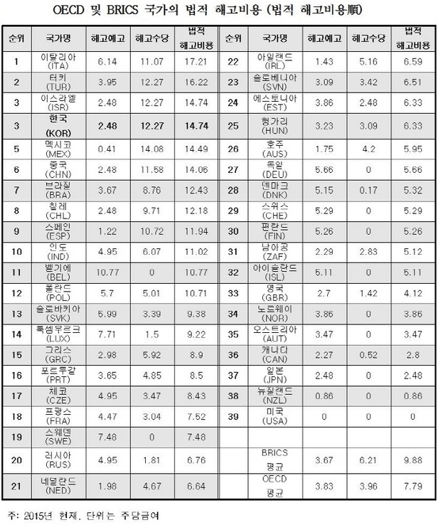 2015년을 기준으로 OECD와 BRICS에 속해있는 39개 국가의 법적 해고비용을 추정한 결과, 우리나라는 근로자 한 명을 해고할 경우 약 3달 반에 해당하는(14.8주) 급여를 의무적으로 지급해야 하는 것으로 나타났다.