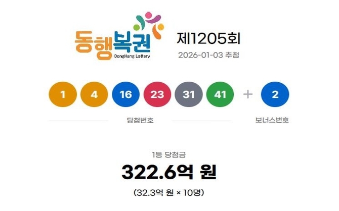 (조세금융신문=박청하 기자) 제1205회 로또복권 추첨에서 '1, 4, 16, 23, 31, 41'이 1등 당첨번호로 뽑혔다. 2등 보너스 번호는 '2'다.