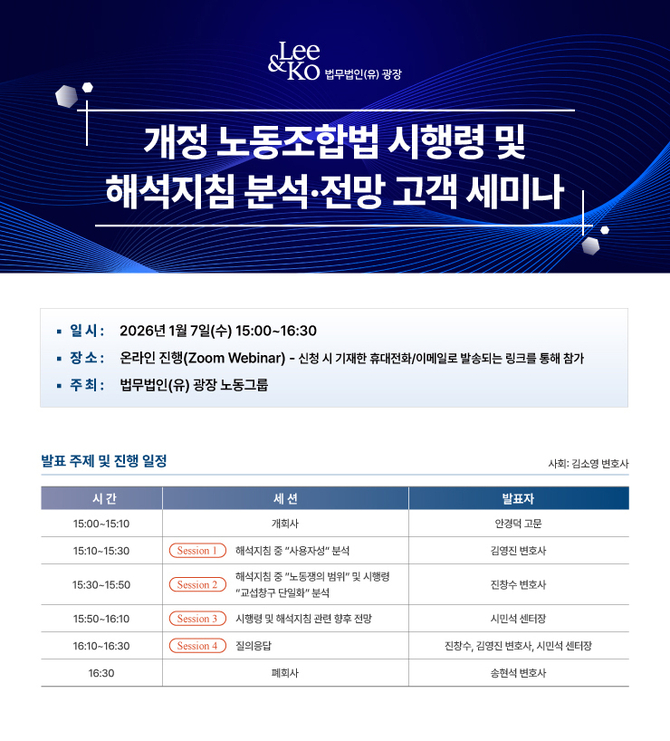 (조세금융신문=고승주 기자) 법무법인 광장(대표변호사 김상곤) 노동그룹이 오는 7일 오후 3시 웨비나 형식으로 ‘개정 노동조합법 시행령 및 해석지침 분석·전망 고객 세미나’를 개최한다.