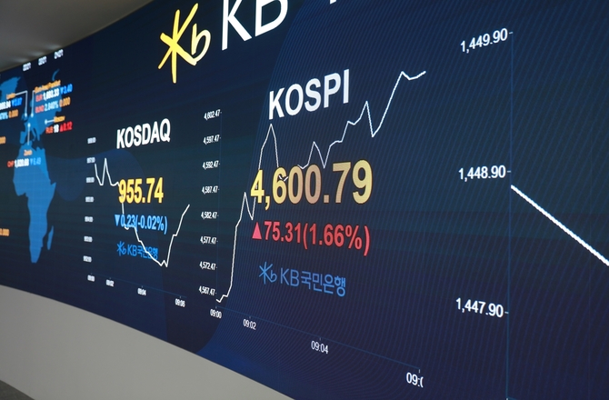 7일 오전 9시 43분 한국거래소(KRX)에서 코스피가 전 거래일 대비 40.86p(0.90%) 오른 4566.34에서 출발해 상승 흐름을 이어가고 있다. 한 때 코스피는 장중 4611까지 치솟았다.