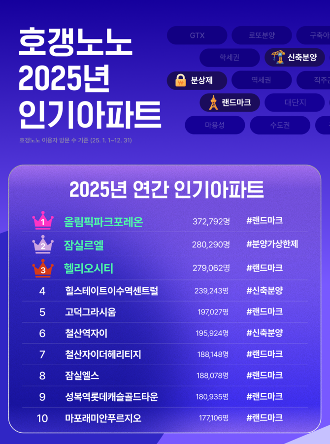 7일 프롭테크 기업 직방이 운영하는 아파트 정보 플랫폼 호갱노노가 집계한 ‘2025년 인기 아파트 랭킹’에 따르면 연간 기준 수요자 관심 1위는 서울 강동구 둔촌동의 ‘올림픽파크포레온’이다. 한 해 동안 37만 명이 넘는 이용자가 해당 단지 정보를 확인했다.