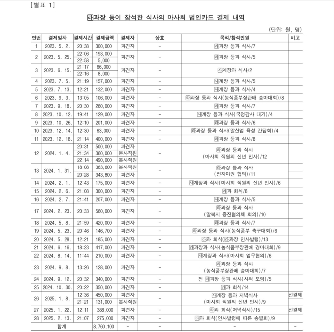 감사원에 의하면 농식품부 ○○과 소속 A과장과 B계장은 2023년 5월 2일부터 2025년 2월 13일까지 총 28회에 걸쳐 식사를 하면서 파견나온 마사회 직원의 법인카드로 모두 876만100원을 결제했다. 이중에는 마사회 법인카드로 결제한 농식품부 ○○과 회식 비용도 446만2700원도 포함됐다.