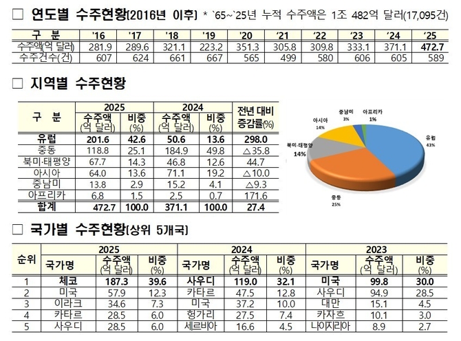 지역별로는 유럽(201억6천만달러)이 체코 두코바니 원전 건설사업(187억2천만달러) 수주 영향으로 전년 대비 298% 급성장하며 전체의 42.6%를 차지했다.