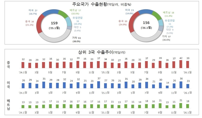 국가별로는 대중국 수출이 15.4% 증가하며 반등 추세를 보였다. 대만 수출 역시 반도체 공급망 효과로 55.4% 폭증했다. 반면 대미 수출은 14.7% 감소했으며, 유럽연합(EU) 수출도 31.7%나 빠지며 대조적인 모습을 보였다.
