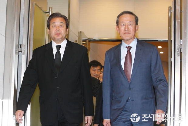 (조세금융신문=전한성 기자) '새누리당-전경련 정책간담회'가 25일 오후 서울 여의도 전경련 컨퍼런스센터에서 열린 가운데 새누리당 김무성(왼쪽) 대표와 허창수 전국경제인연합회장이 나란히 입장하고 있다.