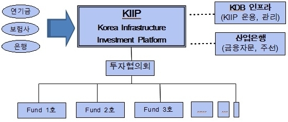 산업은행은 사업의 자문 및 주선을 담당하여 참여기관이 신규 인프라 사업투자에 활발히 참여할수 있도록 하며, KDB인프라는 KIIP의 운용 및 관리를 담당하며, 민간이 개별적으로 투자를 결정하기 어려운 SOC 투자 촉진을 위한 민간투자의 파이프라인 역할을 수행하게 된다.