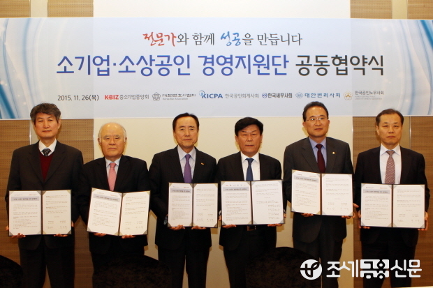 (조세금융신문=나홍선 기자) 중소기업중앙회(회장 박성택)는 26일 강성원 회계사회장, 백운찬 세무사회장, 김용포 노무사회장, 하창우 변호사협회 협회장, 고영회 변리사회 회장 등 5대 전문자격사회 대표가 참석한 가운데 ‘소기업·소상공인 경영지원단(이하 ‘경영지원단’)’ 발족을 위한 공동협약식을 개최했다.