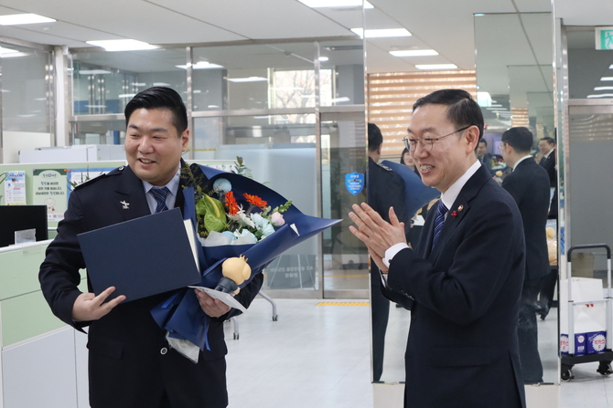 청장이 직원을 기다리는 보기 드문 광경 끝에 현장에서 복귀한 정 주무관은 뒤늦게 수여된 상장과 포상금에 얼떨떨한 표정을 지으면서도 기쁨을 감추지 못했다.