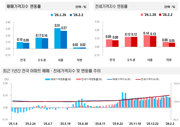 5일 한국부동산원에 따르면 2월 첫째 주 기준 서울 아파트 매매가격은 0.27% 상승하며 전주(0.31%) 대비 오름폭이 축소됐다. 전국 아파트값 역시 0.09% 상승했지만 상승 지역이 줄어들며 시장이 전방위로 확산하기보다는 선별적으로 움직이는 흐름이 나타났다.