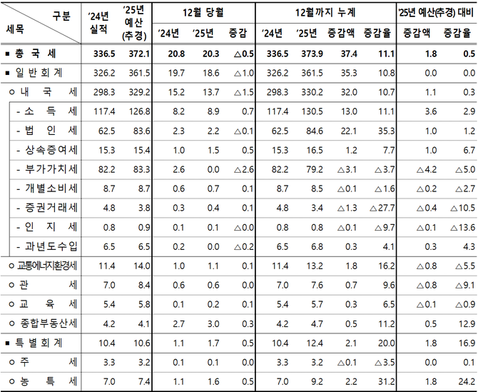 2025년도 국세수입 세목별 현황으로는 전년대비 법인세가 22.1조원, 근로소득세 7.4조원 각각 증가했다.