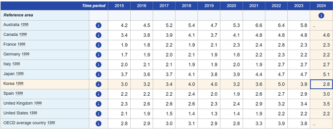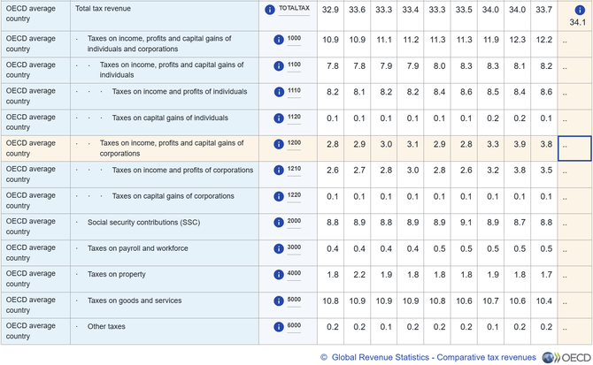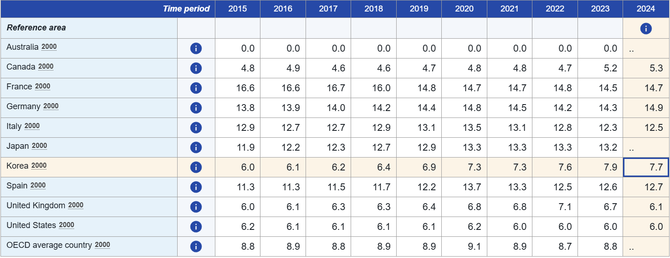 아래의 표는 OECD 통계와 연례 보고서 내 숫자들에서 추출한 OECD 조세부담률과 한국 조세부담률 간 비교다.