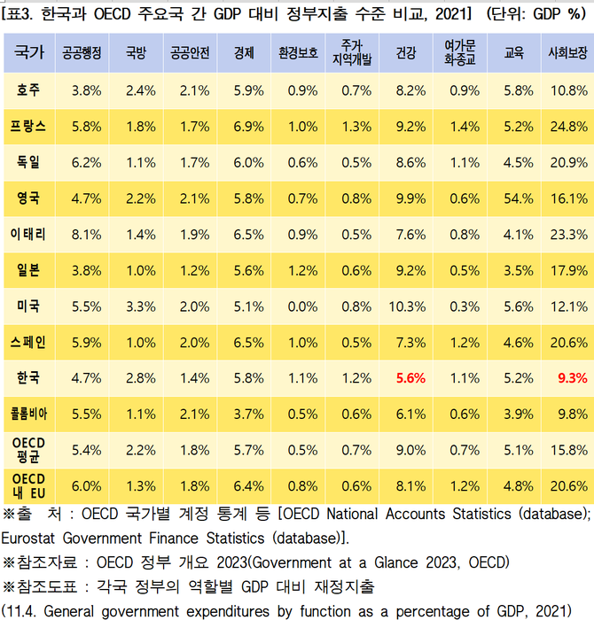 한국의 사회복지-건강 부문 정부 지출 수준은 2021년 기준 GDP 대비 ‘5.6%’에 불과하다.
