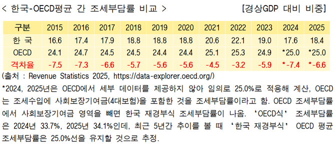 2025년 한국 조세부담률 18.4%인데, 2015~2023년 OECD 조세부담률은 24.3%다. 이를 단순비교하면 –5.9% 정도의 격차가 생긴다.