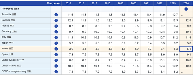 OECD 평균은 9.0%, 의료보험이 문제라는 미국조차 10.3%고, 일본 9.2%, 영국 9.9%, 우리랑 경제규모가 비슷한 스페인 7.3%, 콜롬비아조차 6.1%였다.