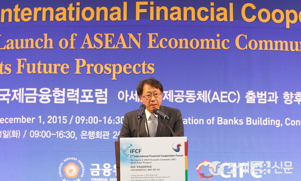 (조세금융신문=전한성 기자) '제2회 국제금융협력포럼 - 아세안경제공동체(AEC) 출범과 향후 전망'이 1일 오전 서울 중구 명동 은행회관에서 열린 가운데 신성환 한국금융연구원장이 개회사를 하고 있다.