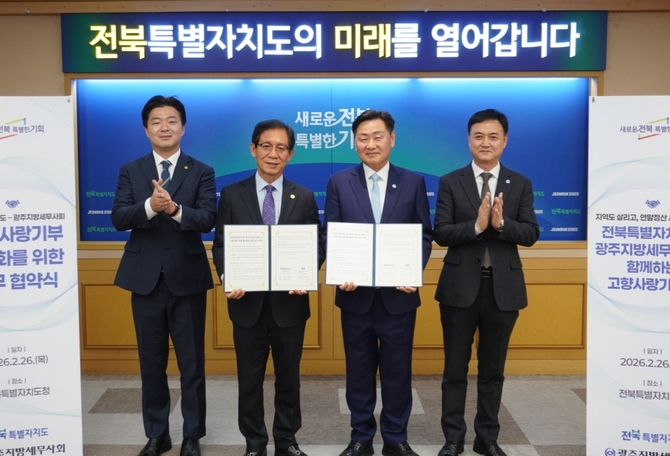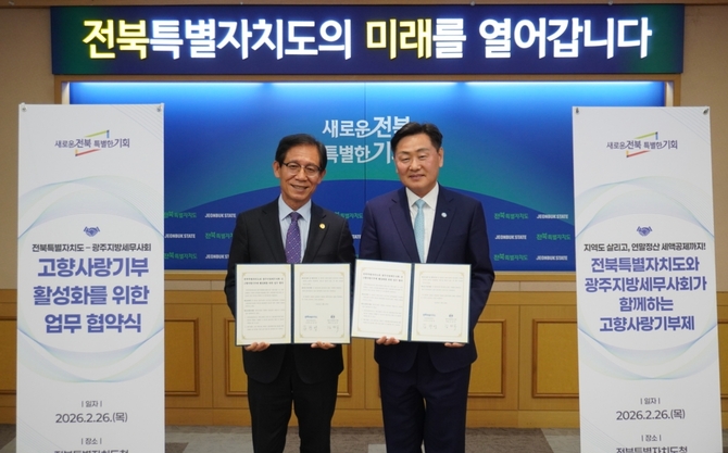 (조세금융신문=김영기 기자) 광주지방세무사회(회장 김성후)와 전북특별자치도(도지사 김관영)는 지난 26일 지역소멸 위기 극복과 지역경제 활성화를 위한 고향사랑기부제 확산 및 도민의 복리 증진을 위하여 업무협약을 체결했다.