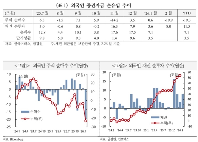 금융은 1월 순유입에서 2월 2조3천억원 순유출로 전환됐고, 운송·장비는 유출세가 이어졌으나 1월 -4조1천억원에서 2월 -2천억원으로 줄었다. 반면, 채권 시장으로는 외국인 자금이 들어왔다.