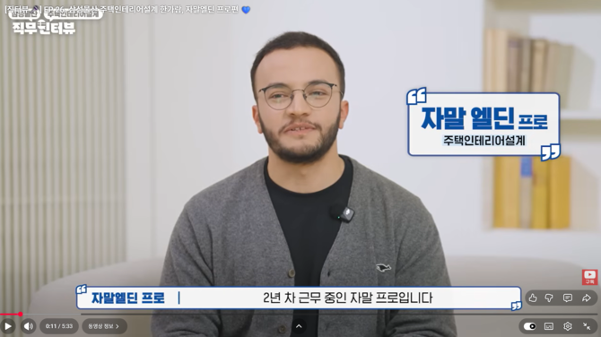 영상에 출연한 한가람 프로는 “주택상품디자인팀에서 인테리어 설계 직무를 맡고 있으며 래미안 아파트의 단위 세대와 커뮤니티 공간을 설계하고 디자인하는 일을 하고 있다”고 말했다.