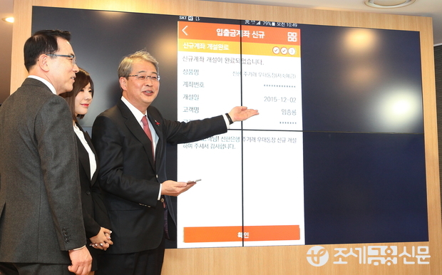 (조세금융신문=전한성 기자) 신한은행이 2일 오전 서울 중구 신한은행 본점에서 비대면 실명확인을 적용한 써니뱅크와 디지털 키오스크를 선보이고 대고객 서비스를 시작한 가운데 임종룡(오른쪽) 금융위원장과 조용병(왼쪽) 신행은행장, 소녀시대 써니가 시연을 하고 있다.