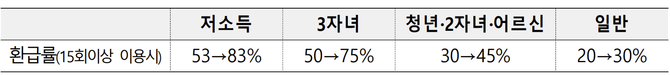 청년·어르신·2자녀 가구 이용자는 30%에서 45%이며, 일반 이용자는 20%에서 30%로 상향된다.