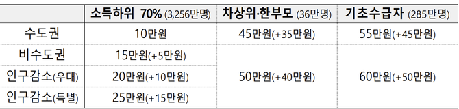 소득 하위 70%의 경우 기본 10만원에 얹어 비수도권은 5만원, 인구감소 우대지역은 10만원, 인구감소 특별지역은 15만원을 추가로 지급한다.