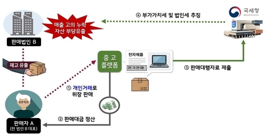 국세청은 중고거래 플랫폼에서 수집한 거래상세내역, 법인의 전자세금계산서 수취내역, 납세자 소명내역 등을 확인한 결과, 재고자산의 부당 유출에 따른 귀속자 소득처분(상여), 신고 누락한 판매법인 B의 부가가치세‧법인세 및 가산세를 부과했다.