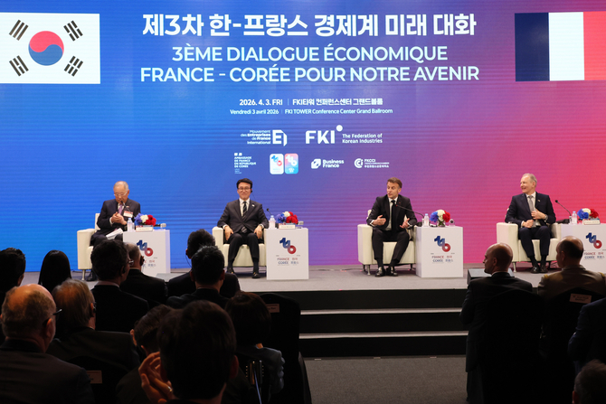 한국경제인협회는 3일 여의도 FKI타워에서 프랑스경제인협회(MEDEF)와 공동으로 '제3차 한-프랑스 경제계 미래대화(Korea-France Business Dialogue for our Future)'를 열었다. 마크롱의 국빈 방한을 계기로 열린 행사에는 김민석 국무총리를 비롯해 양국 기업인·정부 인사 총 300여명이 참석했다.